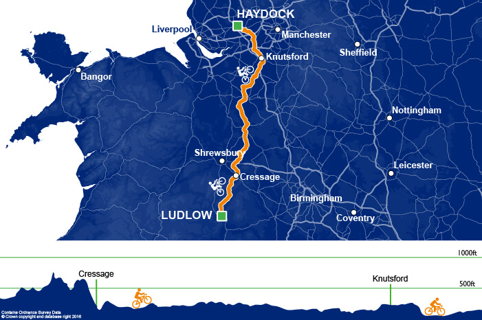 Day 4 leaves the hills behind, and after dropping off the Stiperstones hills the day is mainly flat and should give an opportunity to stretch our legs a little. The end of the day leaves the countryside behind as we enter the industrial towns south around Manchester.